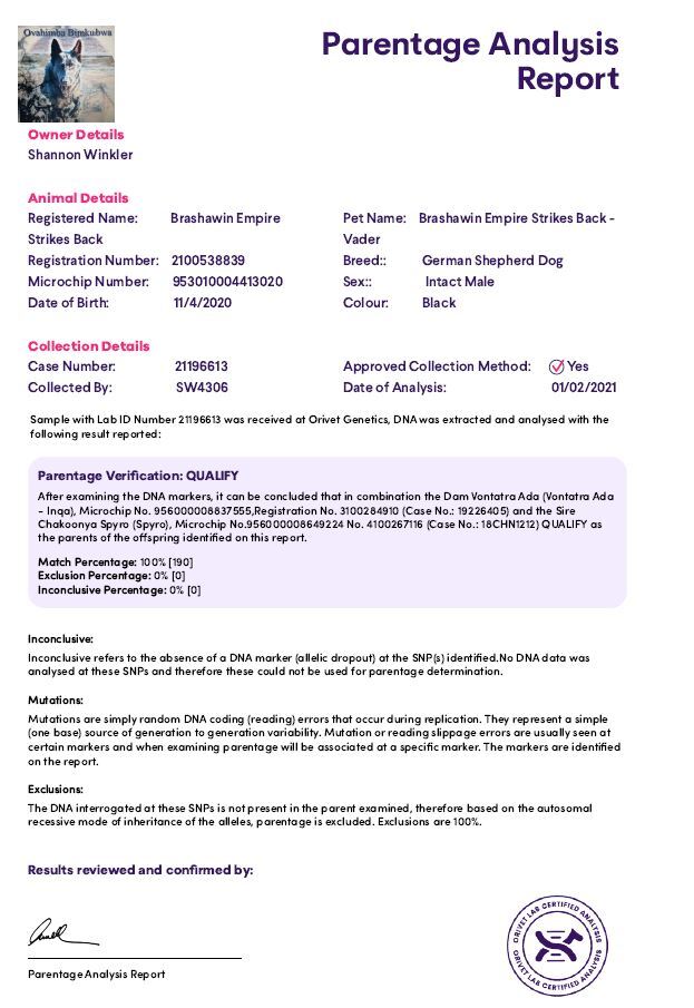 True to his heritage, Vader exemplifies what the German Shepherd was bred to be: courageous yet stable, intelligent yet kind, powerful yet willing to serve. Whether in the field, in the ring, or by his handler’s side, Vader continues to honour the legacy of the breed through his achievements, temperament, and heart.
